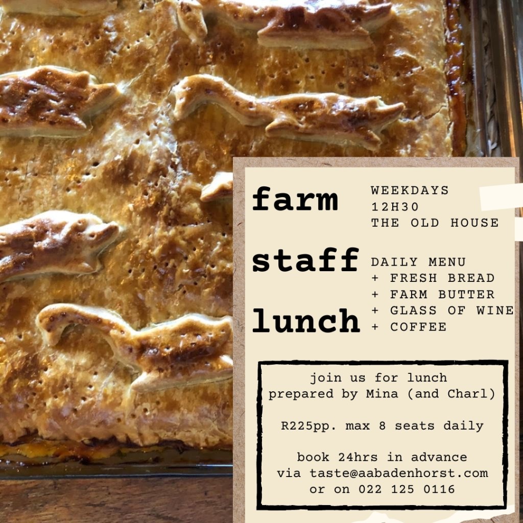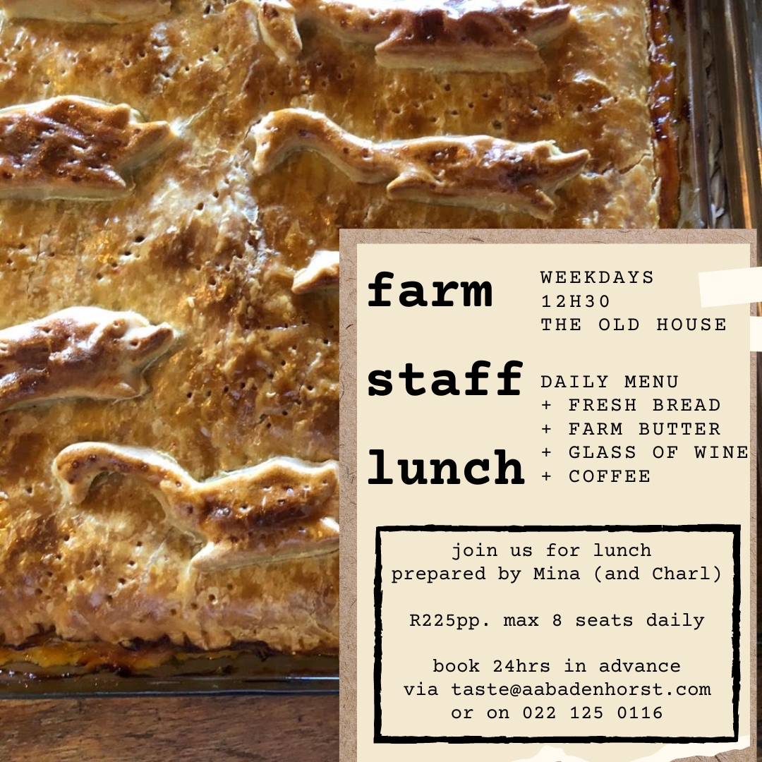 Every day Mina and Charl prepare a hearty balanced farm lunch for the the team – using fresh produce grown right here and meat from our surrounding farms. We are now opening this lunch up to a maximum of 8 extra seats per day.
