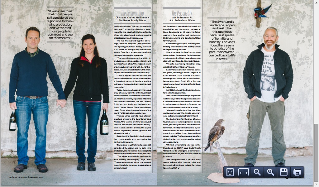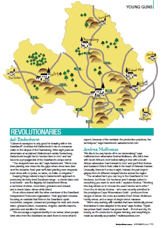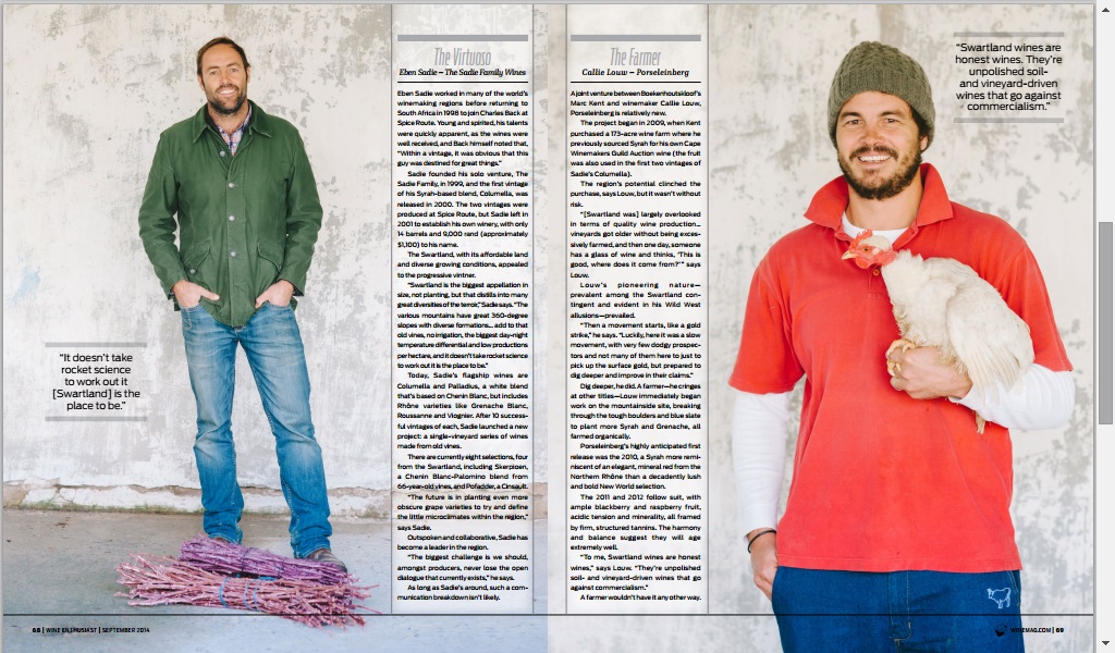 We love this story from the latest issue of Wine Enthusiast. Written by Lauren Buzzeo, photographed by Maree Louw (on Kalmoesfontein) and styled by Cornelia Badenhorst, the article is a beautiful feature of the original revolutionaries – Eben Sadie ‘The Virtuoso’, Callie Louw ‘The Farmer’, Chris and Andrea Mullineux ‘The Dynamic Duo’ and Adi ‘The Personality’.