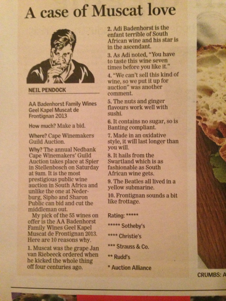 Meanwhile, at the Cape Winemakers Guild Auction, Adi’s 2015 auction wine, the AA Badenhorst Family Wines Graniet-Berg 2013 set a new auction record for a white wine at R7‚000 for a case of six. This news was apparently so big, even my 92 year old Gran told me about it when I returned… “Adi se wyn was op die tv-nuus.”