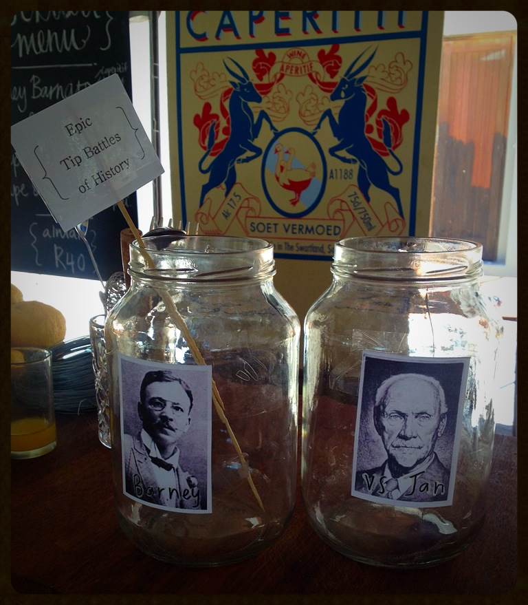 Revolutionaries got to choose between four drinks (while some choose to try all four, numerous times)… On the counter stood two jars: Epic Tip Battles of History Jan Smuts vs Barney Barnato.