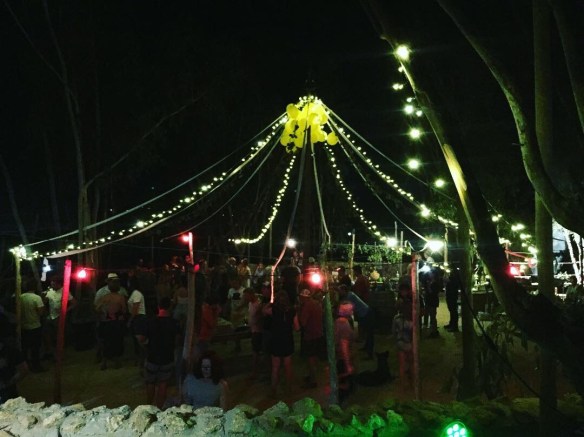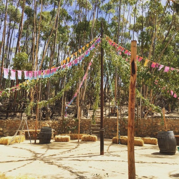 At the ‘top edge’ of the Kalmoesfontein property was a very big Eucalyptus plantation (very common on farms around here as the trees were planted for the long straight poles they produce as well as firewood.) Over the years we’ve slowly cut back this plantation (because they use SO MUCH water and because frankly we’d rather plant wheat, grapes or local trees) but have left a hectare or so on the very top of the hill. In the middle of this bos (Afrikaans for forest) we’ve cleared a section to plant a maypole and have a few parties.